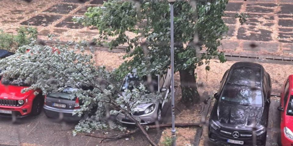 U bloku 38 u Ulici Omladinskih brigada stravična oluja ruši sve pred sobom, a jak vetar čupa drveće iz korena. Jedno deblo palo je na parkiran automobil, pala je i bandera na sred ulice.