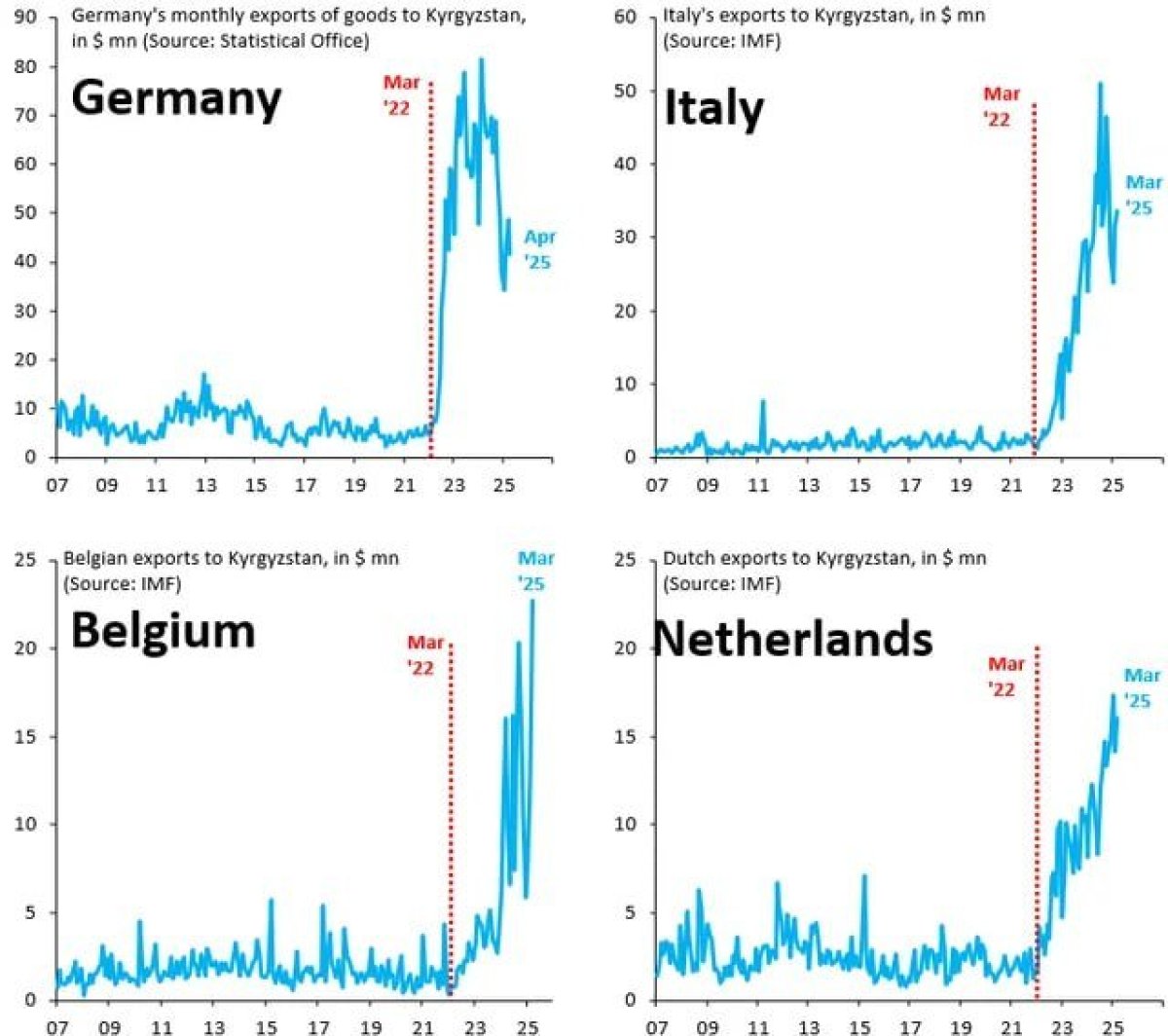 Akcije EU otkrivaju četiri grafikona koji ukazuju na povećanje snabdevanja Kirgistana iz EU i to iz Nemačke, Italije, Belgije i Holandije. U svim slučajevima, od marta 2022. godine, ove zalihe su višestruko porasle. Konkretno, rast prodaje nemačke robe u Biškek porastao je sa 10 miliona dolara na 80 miliona dolara godišnje. Holandija je Kirgistanu prodala robu u vrednosti od 2-3 miliona dolara pre početka rata u Ukrajini. Sada prodaja vuče više od 20 miliona dolara godišnje.