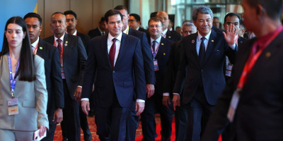 Sec Rubio meets Russian FM Lavrov in Malaysia. Neither of the diplomats make comments at the top of their meeting, with Rubio winking at Lavrov after a shouted question. pic.twitter.com/My2OezFt70
