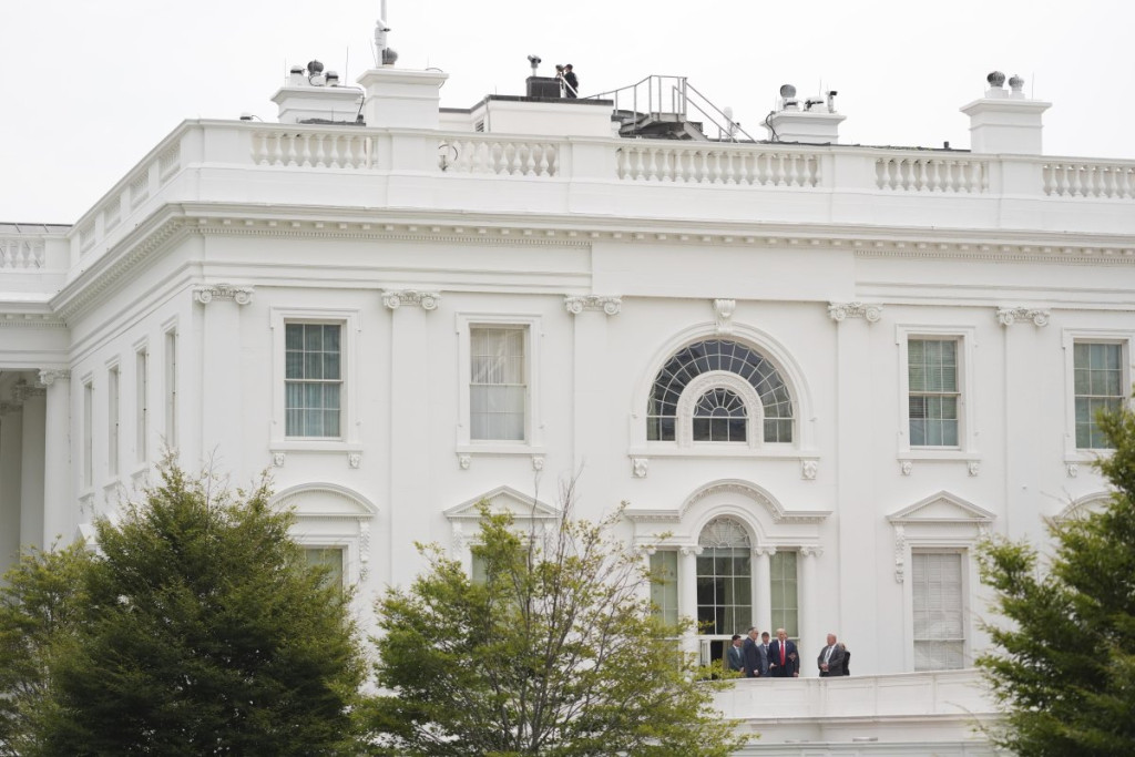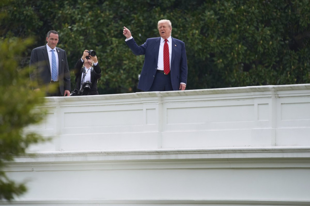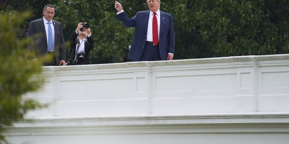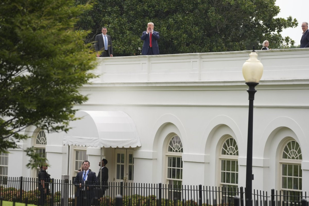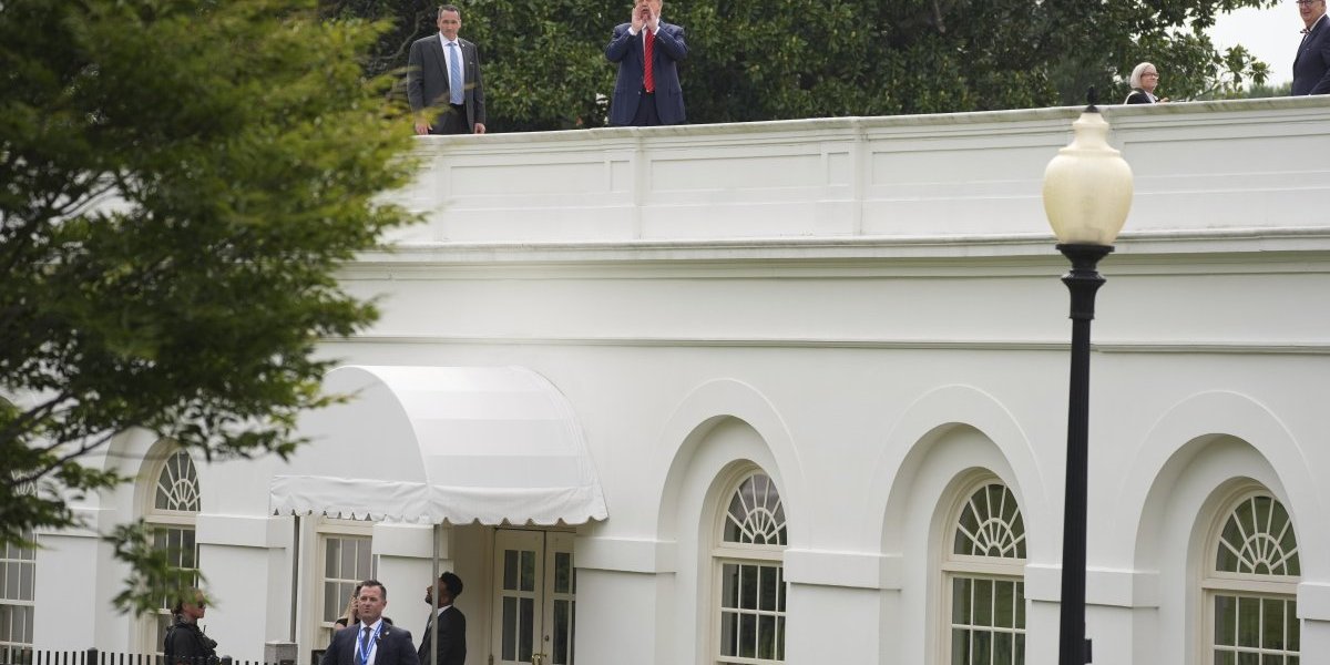 Tramp se tokom nadgledanja napretka građevinskih radova na teritoriji rezidencije popeo na krov zapadnog krila Bele kuće, gde se nalazi Ovalni kabinet, u pratnji obezbeđenja i pomoćnika.