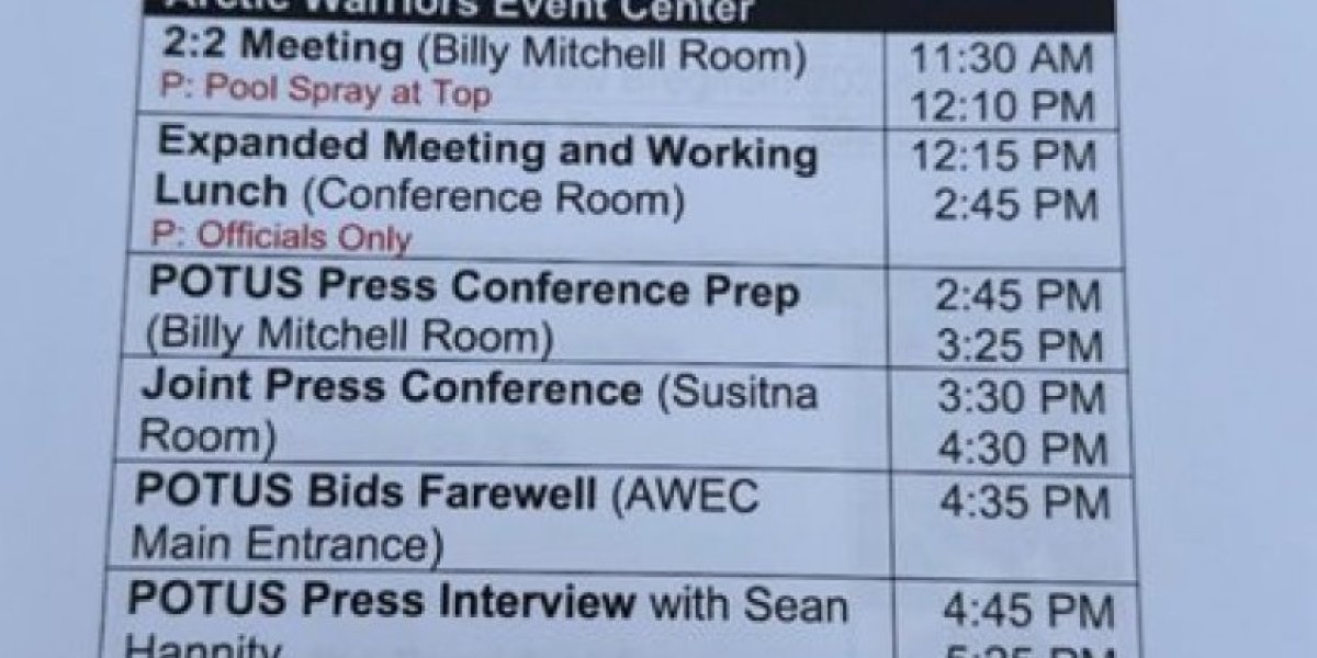 Oko devet sati ujutru po lokalnom vremenu, troje gostiju hotela „Captain Cook“, luksuznog objekta sa četiri zvezdice udaljenog dvadesetak minuta od vojne baze Joint Base Elmendorf–Richardson, gde je održan samit, pronašlo je ispisane papire. NPR je imao uvid u fotografije dokumenata koje je snimio jedan od gostiju, ali njegov identitet nije objavljen iz bezbednosnih razloga.