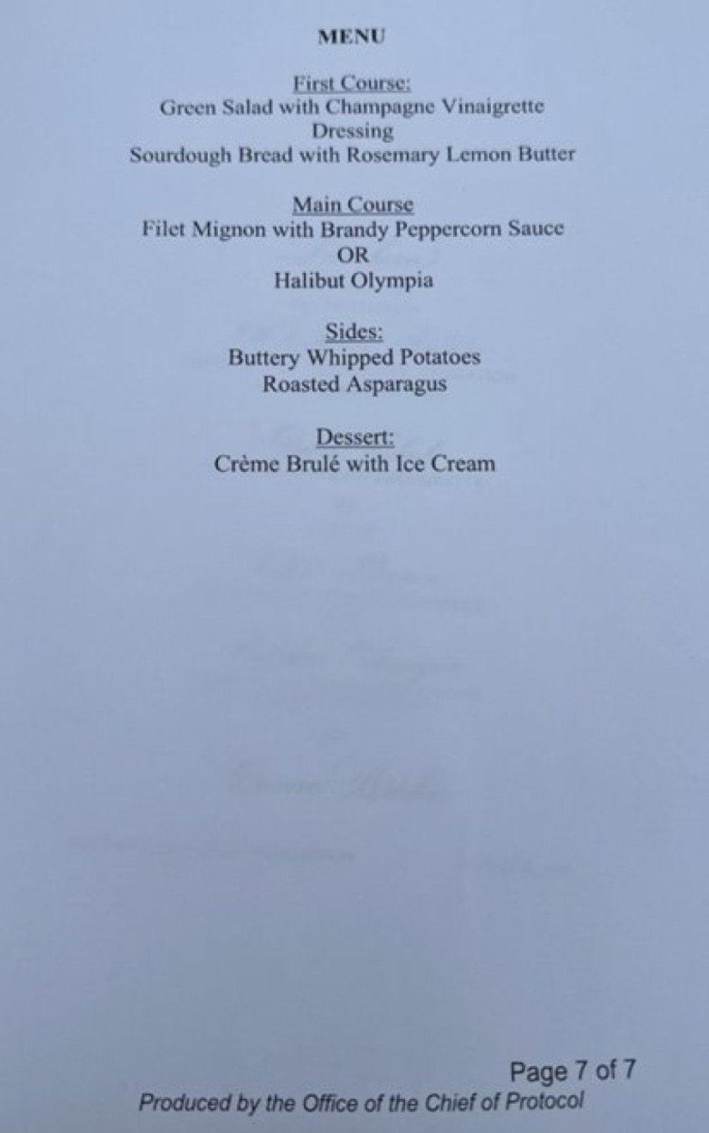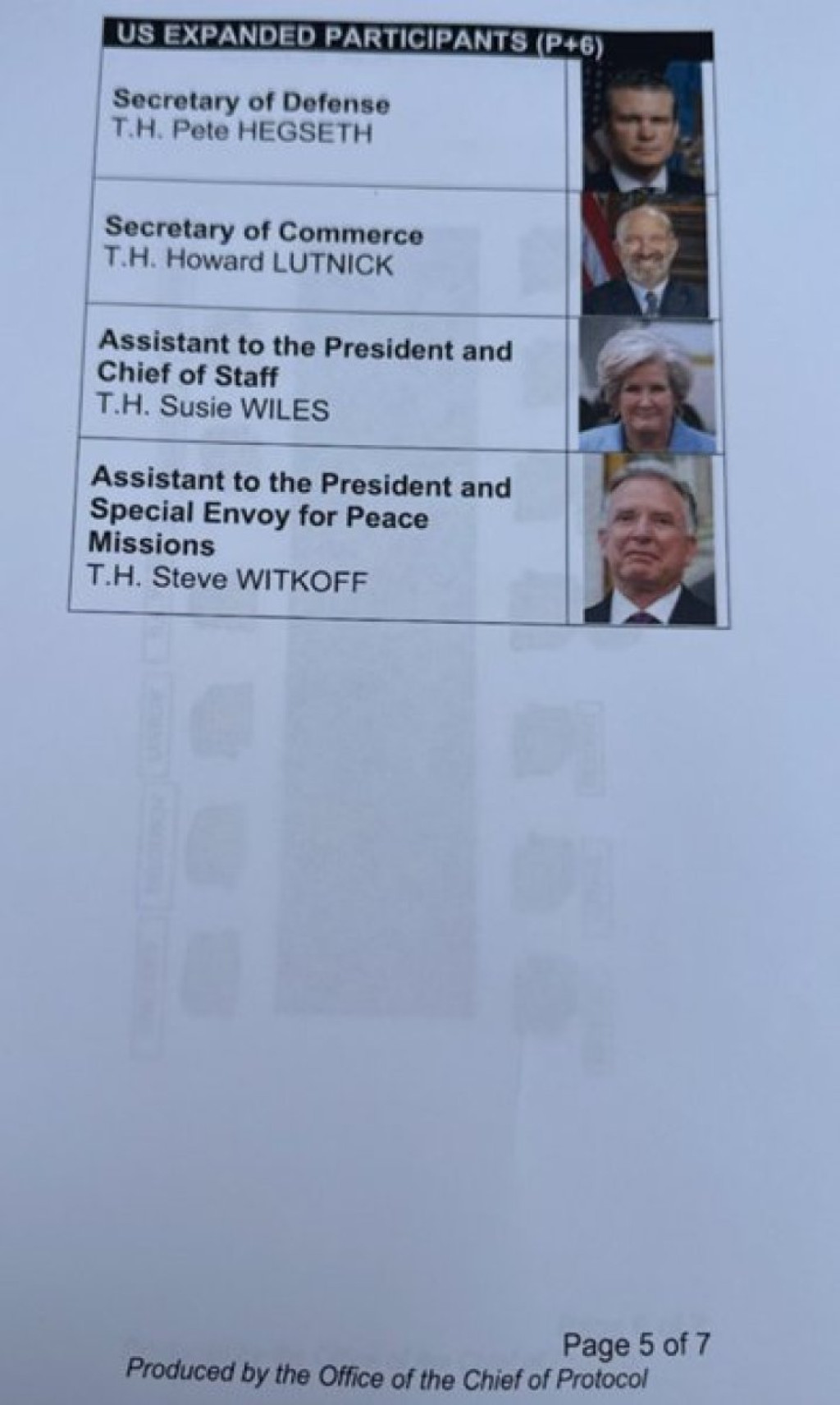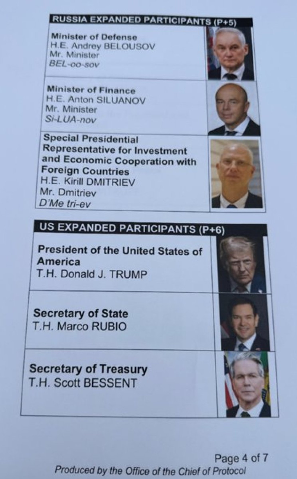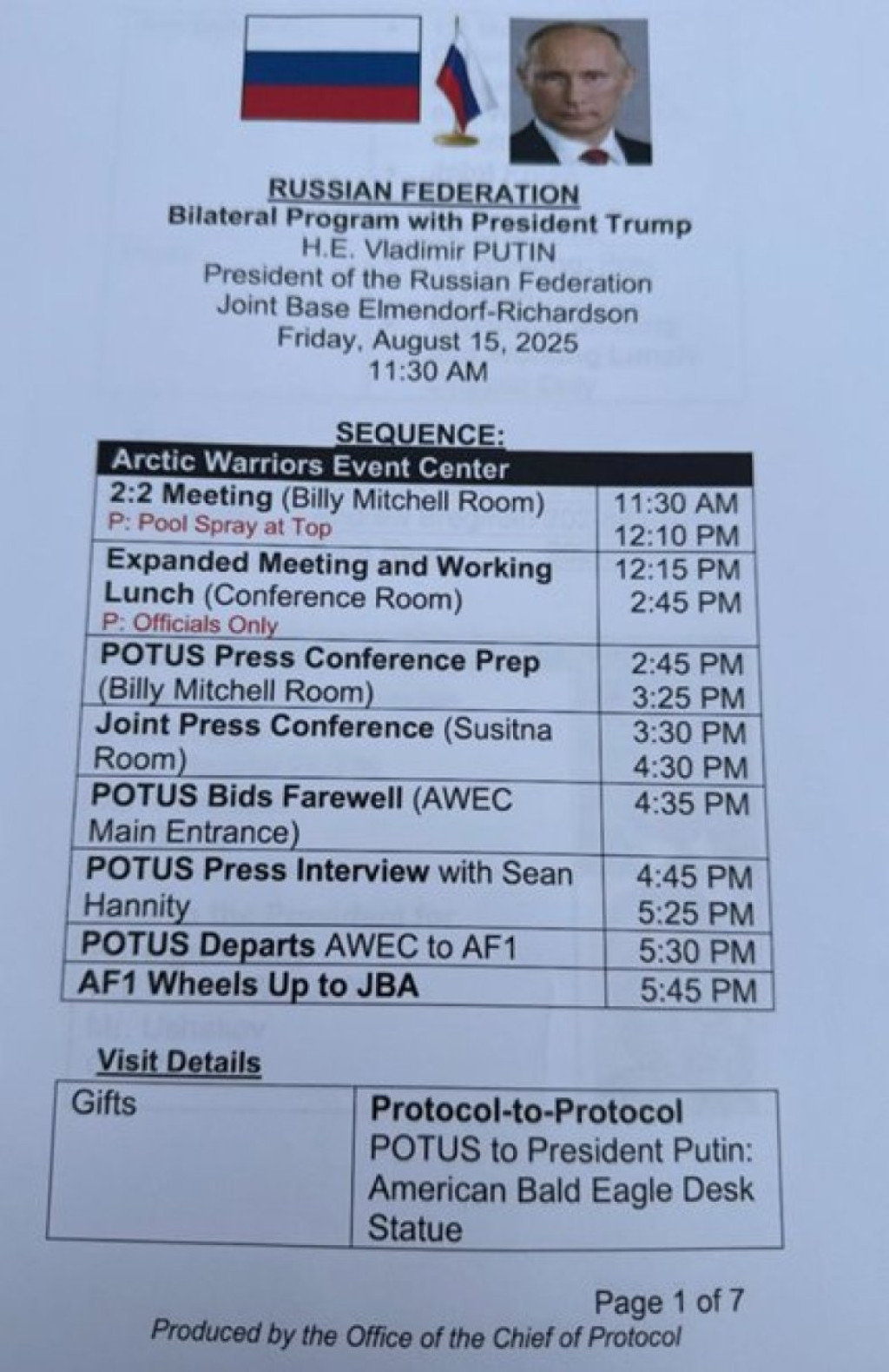 Šesta i sedma stranica opisivale su plan ručka na samitu, uz detaljan jelovnik. Pisalo je da će obrok biti održan „u čast Njegove ekselencije Vladimira Putina“. Planiran je trodelni meni: zelena salata, izbor između filea mignona i halibuta „Olympia“, a za desert crème brûlée. Predviđeno je i da Tramp i Putin sede jedan naspram drugog, okruženi svojim najbližim saradnicima. Uz Trampa su trebali da budu državni sekretar Marko Rubio, ministar odbrane Pit Hegset, šefica kabineta Suzi Vils, ministar finansija Skot Besent, ministar trgovine Hauard Lutnik i specijalni izaslanik Stiven Vitkof. Do Putina su trebali da sede ministar spoljnih poslova Sergej Lavrov i savetnik za spoljne poslove Jurij Ušakov.