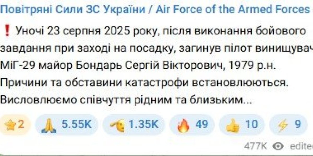 "U noći 23. avgusta 2025. godine, nakon izvršenja borbenog zadatka prilikom prilaska na sletanje, poginuo je pilot lovca MiG-29, major Sergej Viktorovič Bondar, rođen 1979. godine",napisano je u izveštaju.