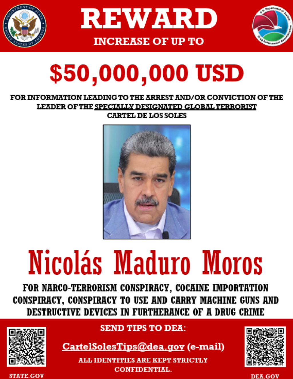 Međutim, plakat sa nagradom ne pominje političku karijeru Nikolasa Madura. Ne opisuje ga kao diktatora koji je organizovao prevaru na prošlogodišnjim predsedničkim izborima u Venecueli, kako Vašington veruje. Bela kuća ga je označila kao vođu kartela Sunca i traži ga zbog narkoterorizma, uvoza kokaina i učešća u zaveri radi krijumčarenja narkotika i oružja.