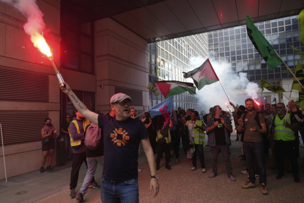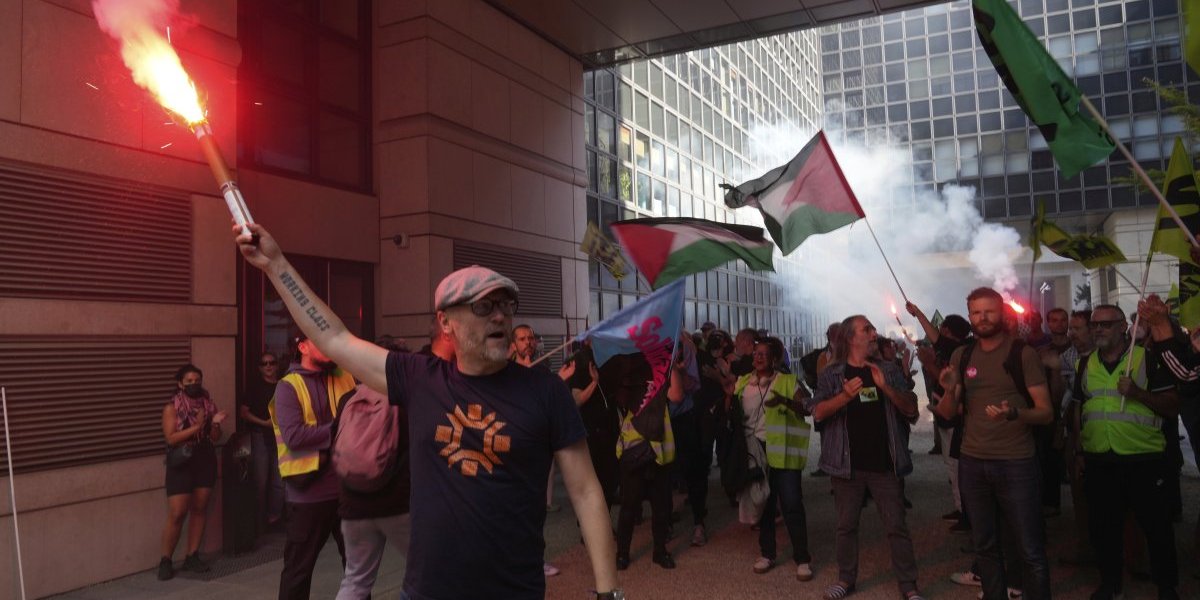Demonstranti u Marselju zaustavili su rad fabrike „Eurolinks“, koja proizvodi oružje, i razvili natpis „Zatvorite genocidnu fabriku“.