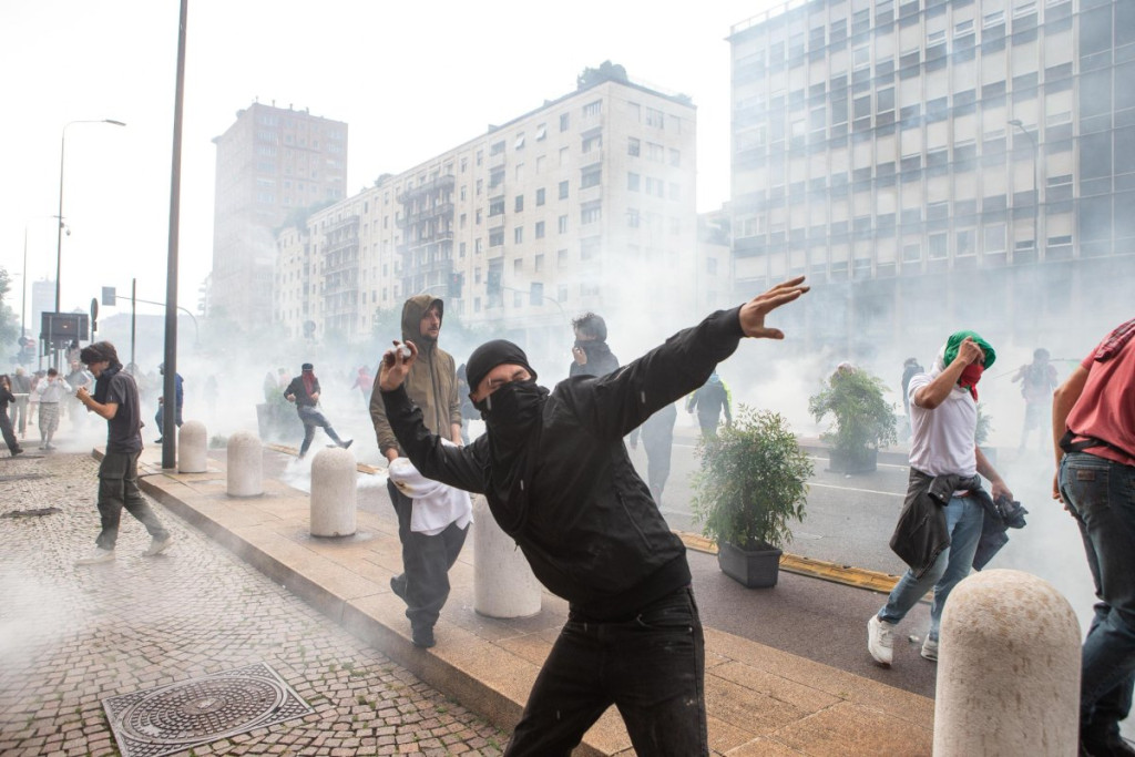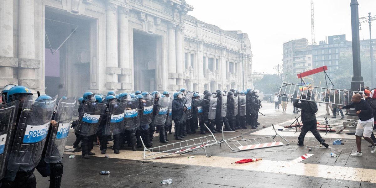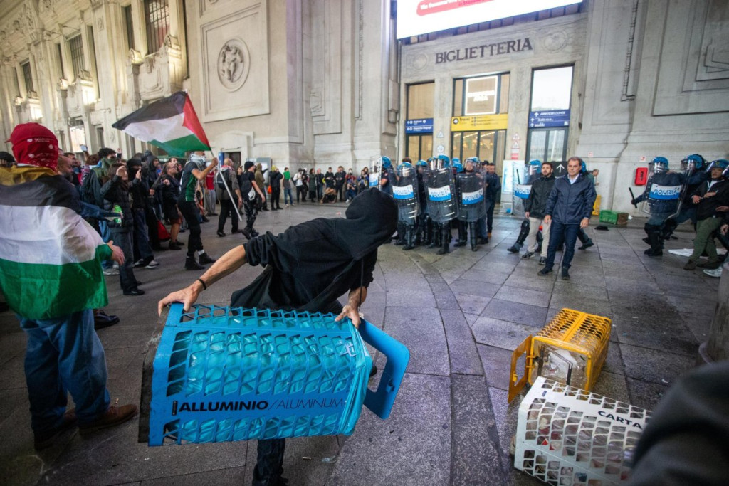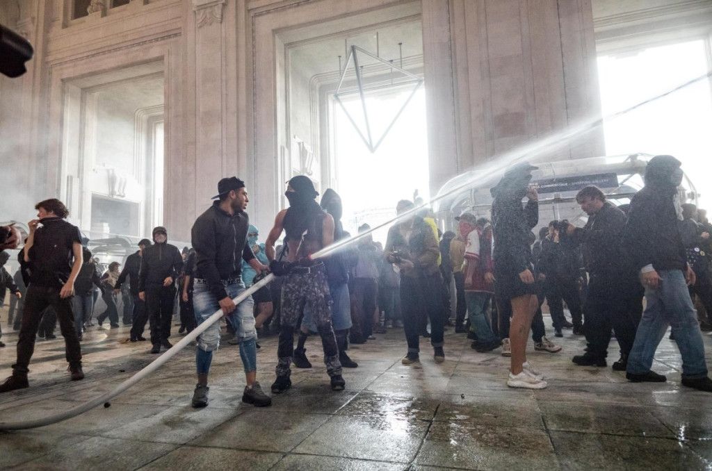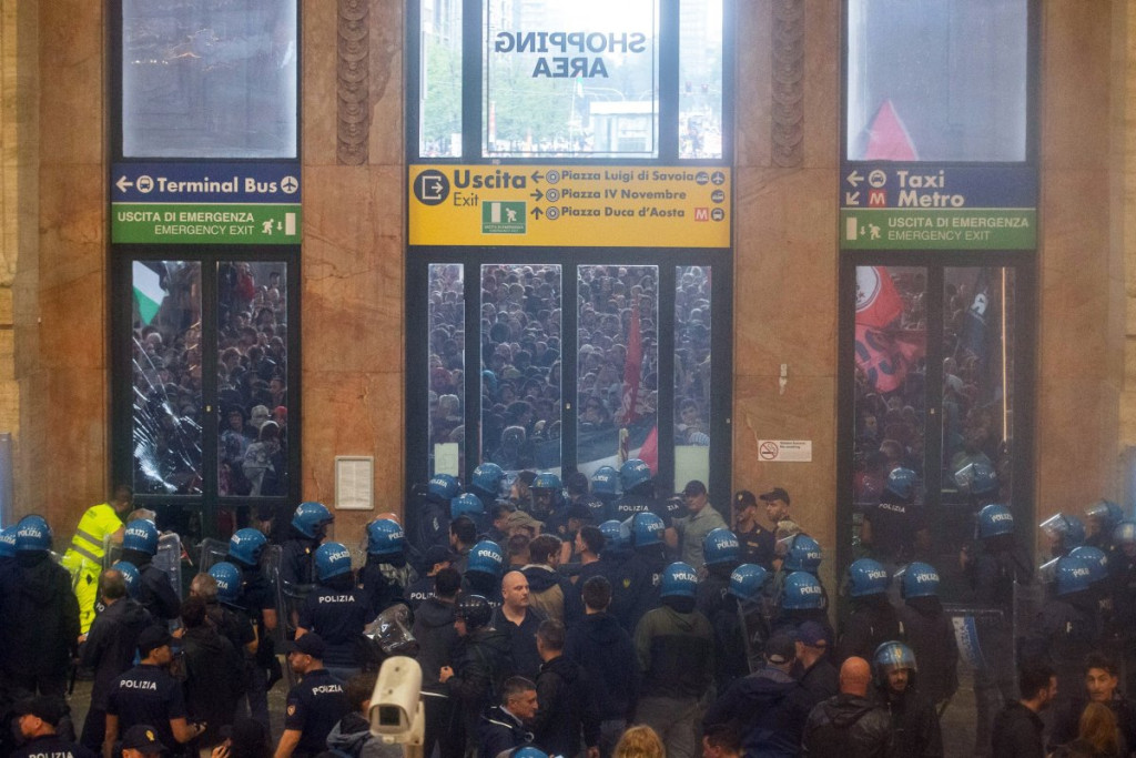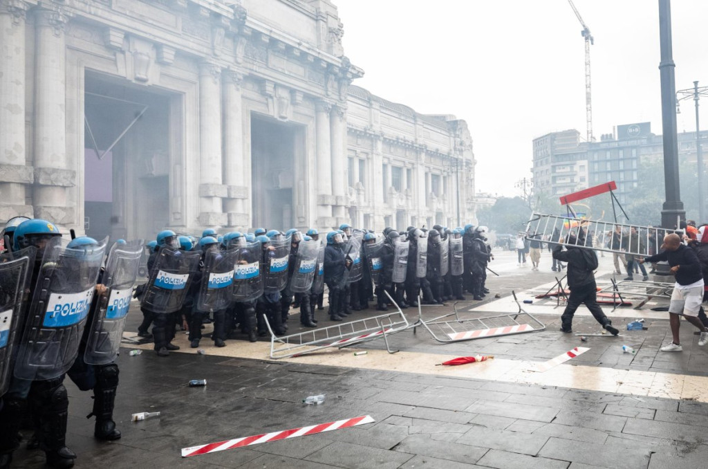 Demonstranti u Milanu krenuli su u otvoreni sukob s policijom – gađali su ih polomljenim predmetima i ukradenim vatrogasnim crevima. U naletu nasilja razvaljena su glavna vrata železničke stanice, a kretanje vozova bilo je blokirano, slično kao tokom ranijih protesta u Rimu.