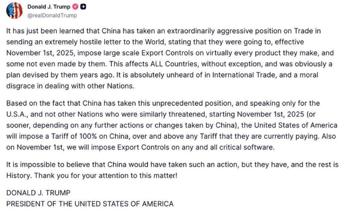 Američki predsednik Donald Tramp je u petak najavio dodatnih 100 odsto carina na Kinu i zapretio da će otkazati samit sa Si Đinpingom, ponovo pokrećući trgovinski rat sa Pekingom u sporu oko ograničenja izvoza retkih zemnih minerala.