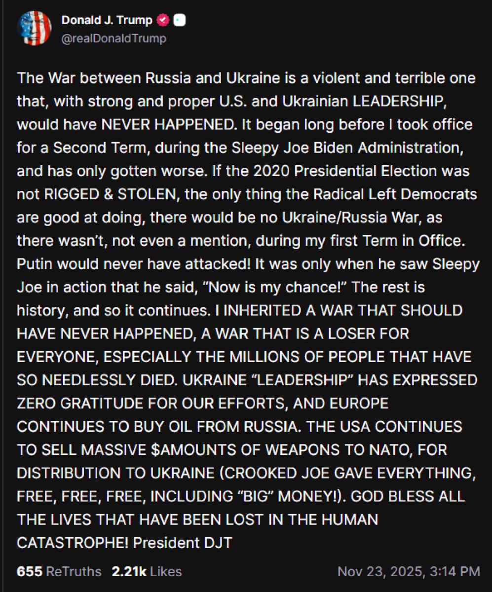 „Rat između Rusije i Ukrajine je nasilan i strašan sukob koji se, uz snažno i ispravno američko i ukrajinsko vođstvo, nikada ne bi dogodio. Počeo je mnogo pre nego što sam preuzeo drugi mandat, za vreme administracije Uspavanog Džoa Bajdena, i samo se pogoršao.“