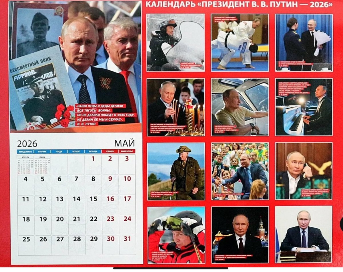 Kalendar, koji se prodaje u radnjama i kioscima, sadrži pažljivo odabrane fotografije ruskog lidera u dinamičnim pozama – dok trenira džudo, vozi motorne sanke, planinari ili svira klavir. Uz slike su citati iz njegovih govora, poput: