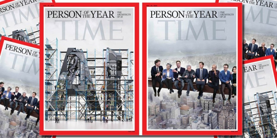 Časopis "Tajm" je ove godine pripremio dve naslovnice: umetničku ilustraciju slova AI okruženih radnicima i sliku koja prikazuje lidere u tehnološkoj industriji.