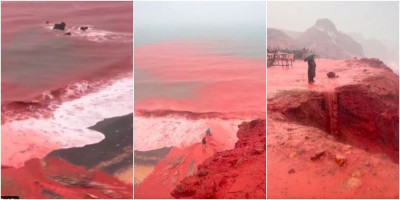 Video-snimci i fotografije podeljeni na internetu prikazuju kako kišnica spira bogate crveno mineralne padine u obližnje more, bojeći vodu i peščanu obalu u intenzivnu crvenu boju.