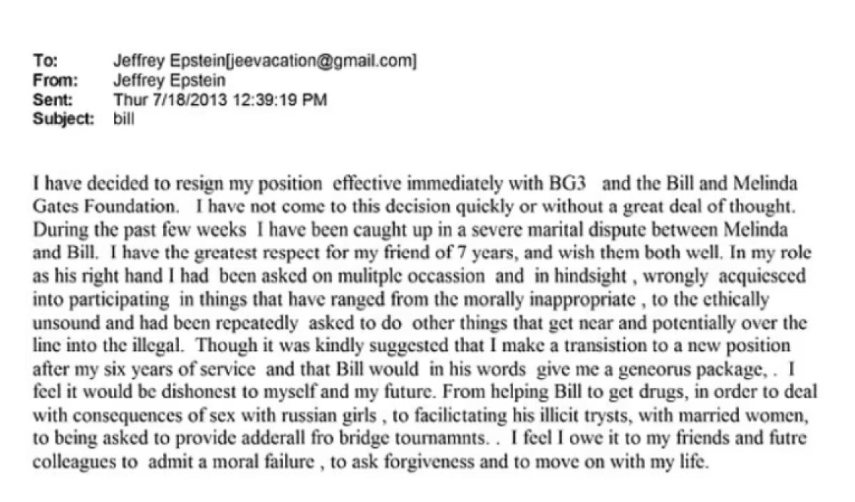 Iste noći, u 1:03 ujutru, Epstein je poslao još jedan imejl u kojem najavljuje ostavku u humanitarnoj organizaciji "Bil i Melinda Gejts", ali s obzirom da nikada nije radio za za ovu organizaciju, veruje se da je poruku sastavio u ime druge osobe.