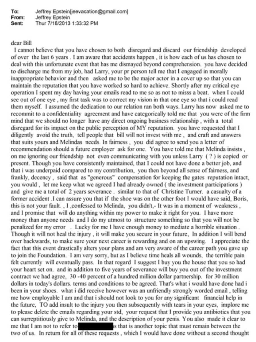 Reč je o dva mejla datirana na 18. jul 2013. godine, koji deluju kao da ih je sastavio Epstin. Oba su poslata sa njegovog mejl naloga i vraćena na isti taj nalog, bez ikakvog dokaza da su ikada stigla do Gejtsa. U dokumentima se ne vidi nijedan mejl nalog povezan sa Bilom Gejtsom, a poruke nisu potpisane.