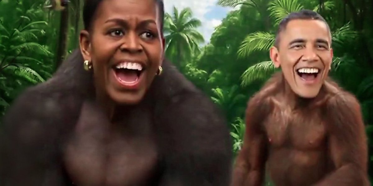 Pred kraj jednominutnog snimka, Obama i bivša prva dama SAD pojavljuju se u umetku koji traje jednu sekundu, sa licima montiranim na tela majmuna.