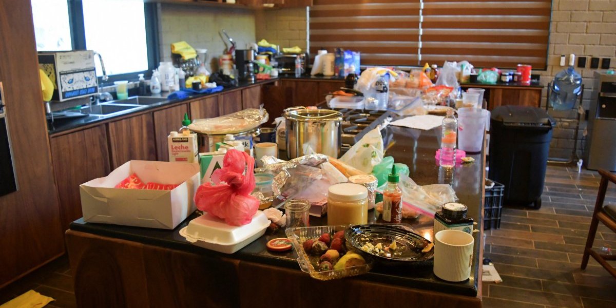 U kuhinji je izgledalo kao da je eksplodirala bomba. Pult je bio prekriven posudama za hranu za poneti, trulim jagodama, kutijama od mleka i flašama vode, prema fotografijama koje je objavio Rojters. Krompir i paradajz bili su na podu.