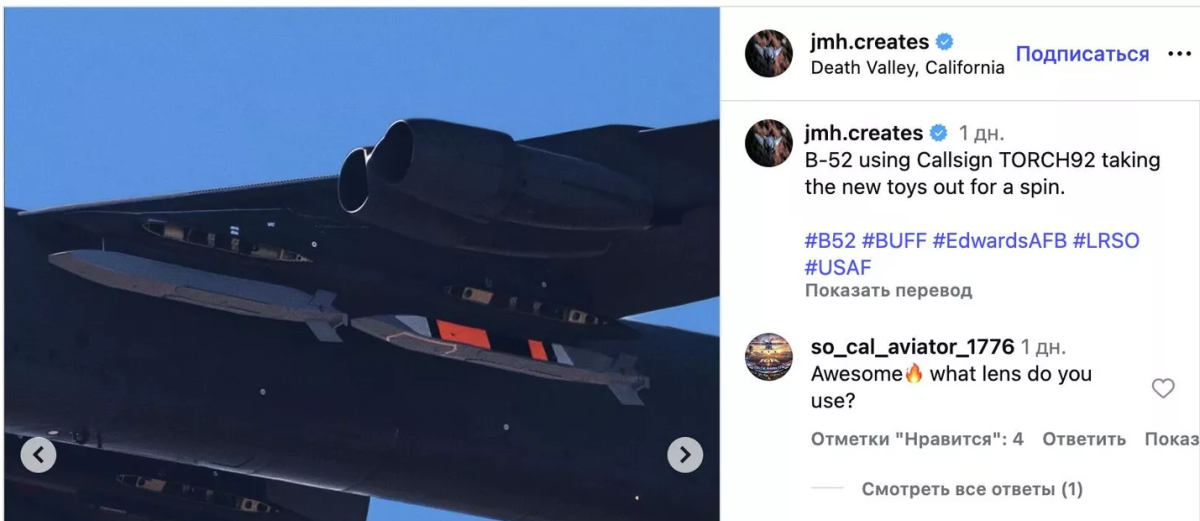 Letelica je uočena u blizini vazduhoplovne baze Edvards, gde se tradicionalno sprovode testiranja novih vojnih sistema. Ispod levog krila bombardera nalazile su se dve rakete ili testni modeli – jedna obojena u tamno sivu boju, dok je druga imala kombinaciju sivih, crnih i narandžastih oznaka, navodi Vor zon.