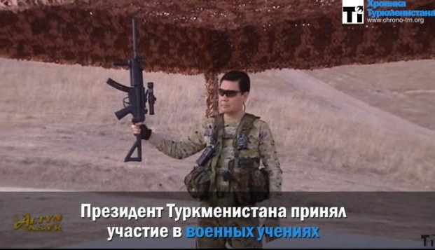 Na tom videu on puca iz automatskog oružja i pištolja, baca noževe s velikom preciznošću, izdaje daljinsko naređenje helikopteru da izvede napad na neku metu. Za sve to vreme aplaudiraju mu postrojeni oficiri turkmenistanske vojske.