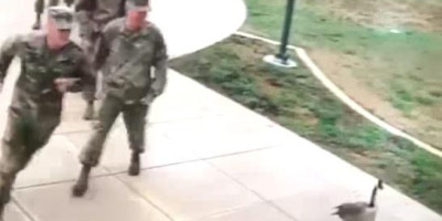 Na snimku se vidi kako gusan naleće na jednog vojnika. Muškarac je odmah odskočio u stranu i pobegao.