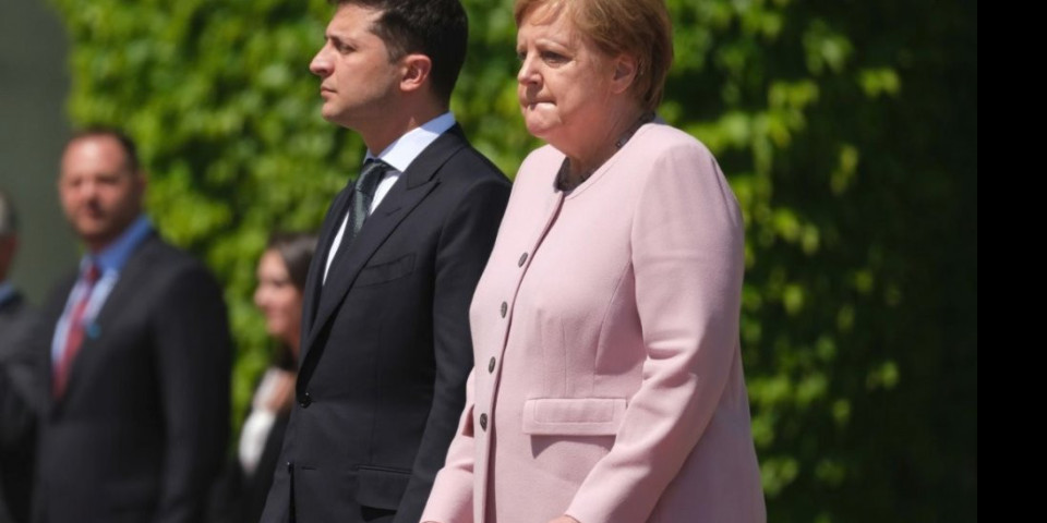 Merkel je stajala pored Zelenskog na suncu dok je vojni bend svirao himne Nemačke i Ukrajine kada je počela da se trese.