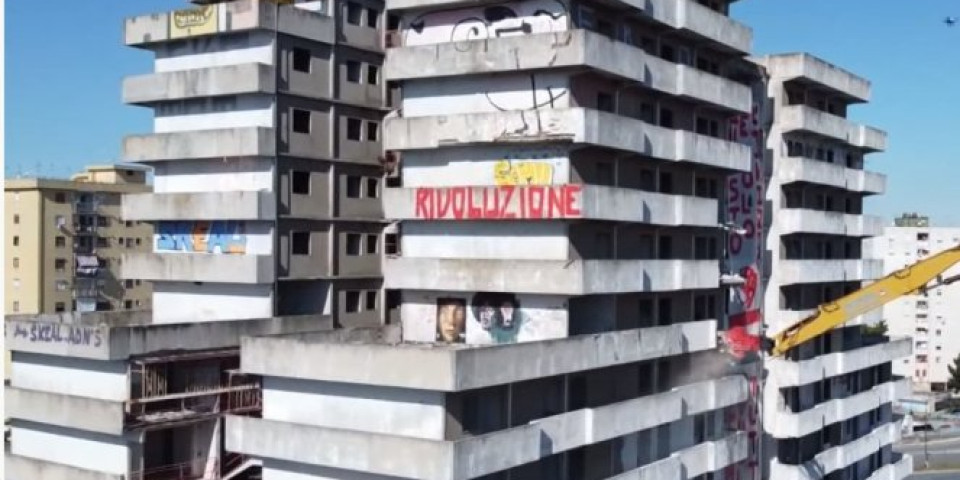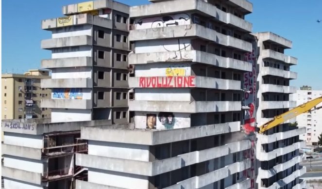 Mehanički kopači uronili su u fasadu jednog od betonskih tornjeva u obliku gigantske jedrilice, u kvartu Skampia koji je bio središte ilegalne trgovine drogom u Italiji i inspirisao hit seriju iz 2014. godine "Gomora".
