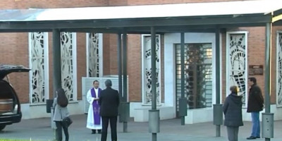 Otac Eduar, katolicki sveštenik obučen za misu, izlazi iz zgrade da dočeka članove porodice koji su došli da odaju poslednju počast po nacionalnim pravilima, svaka grupa je ogranicena na pet ili manje ljudi.