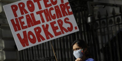 Viz je sama stajala ispred kabineta u Dauning stritu sa maskom za lice i transparentom na kome je pisalo "Zaštitite zdravstvene radnike", prenosi AP.