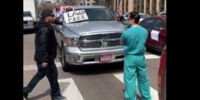 Dve medicinske sestre obučene u hirurška odela stajale su usred prometne ulice u Denveru u Koloradu, kako bi blokirala stotine demonstranata koji su se uputili na protest zbog naredbe vlade da ostanu kod kuće, koja ima za cilj da uspori širenje smrtonosnog koronavirusa