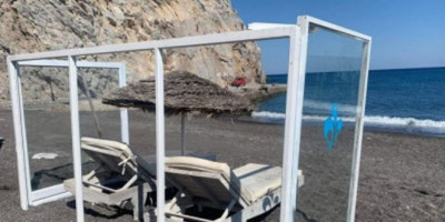 Na rajskom grčkom ostrvu Santorini postavljene su prve ležaljke sa zaštitnim pleksiglasom sa obe strane koji će obezbediti bolju zaštitu tokom pandemije korona virusa.