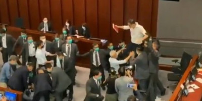 S današnje sednice su izbačeni opozicioni, prodemokratski poslanici pošto su podigli plakate na kojima je pisalo "Zloupotreba vlasti" i "KP Kine gazi zakonodavstvo Honkonga".
