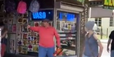 Na videu koji je objavljen na Twitteru muškarac u crvenoj majici dugih rukava i farmerkama maše motornom testerom prema prosvjednicima na pločniku ispred jedne trgovine. Do petka večer video je pregledan skoro milion puta.