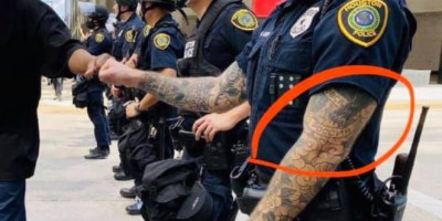 So, they finally have a piece of evidence for #Russia's interference into #USAProtest. One of the cops in Houston flashed out a tatoo that reads "Россия" ("Russia"). pic.twitter.com/ZVHdW9TZzD