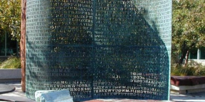 Kriptos se nalazi u dvorištu ispred sedišta CIA. Zakrivljena, bakarna ploča visoka 3,5 metra i široka šest, skulptura je prepuna slova.