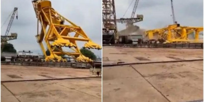 Televizijski snimak je prikazao kako novi kran svom snagom udara u zemlju na državnom brodogradilištu u tom lučkom gradu.