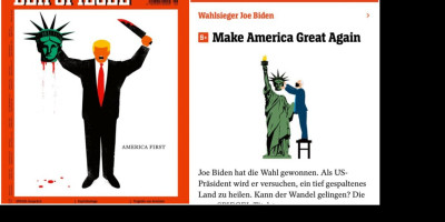 Uticajni nemački magazin "Špigl" objavio je posle pobede Džoa Bajdena na predsedničkim izborima u SAD naslovnu stranu, koja je sušta suprotnost onoj koju je objavio posle pobede Donalda Trampa