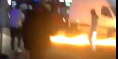 Video snimci objavljeni na tviteru, koji su za sada još uvek nepotvrđeni, prikazuju muškarca kako sipa neku tečnost na asfalt pre nego što ju je zapalio pred zaprepašćenim posmatračima.