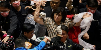 Kada je premijer počeo da govori predstavnici KMT-a su ga zasuli svinjskim iznutricama i počela je tuča poslanika.