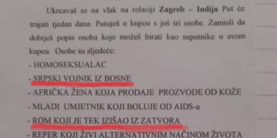 Nastavnica veronauke u jednoj osnovnoj školi u Rijeci je tražila od učenika da kažu zašto (ne) žele da u vozu sede pored starijeg monaha s Biblijom u rukama, homoseksualca, srpskog vojnika iz Bosne ili prostitutke iz Berlina