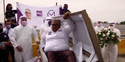 Majorga je na predizborni skup, koji se održao na mostu između meksičkog pograničnog grada Huareza i El Pasa u Teksasu, stigao u kovčegu. Pratili su ga njegovi saradnici odeveni u zaštitnu medicinsku opremu, a u rukama su nosili bukete cveća da bi tako skrenuli pažnju na broj žrtava koronavirusa koji u ovoj zemlji prelazi čak 200.000.