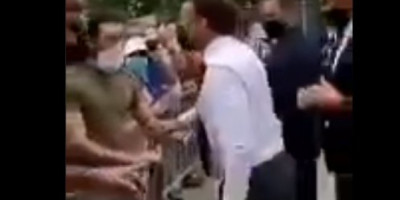 U video snimku koji se pojavio na društvenim mrežama, vidi se Makron koji šeta kroz masu, kao i da pruža ruku čoveku sa maskom na licu da ga pozdravi, a koji mu odgovara "Dole Makronija" i zatim ga udara u lice, prenosi Rojters.