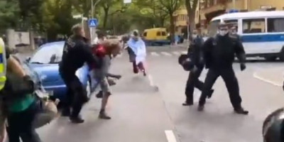 Snimak, koji je navodno snimljen tokom protesta protiv zatvaranja kovid 19 u Berlinu u nedelju, prikazuje ženu koja je pokušala da prođe pored policajca i policajca koji je hvata za vrat obema rukama i snažno baca na zemlju, preneo je RT.