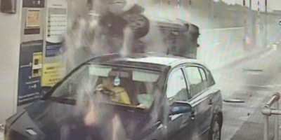 Zastrašujući snimak sa video nadzora prikazuje trenutak kada je automobil vozača koji je bio pod dejstvom droge uleteo u okvir naplatne rampe i kako se sudario sa drugim vozilom koji je stajao na naplatnoj rampi i zgnječio ga s vrha.