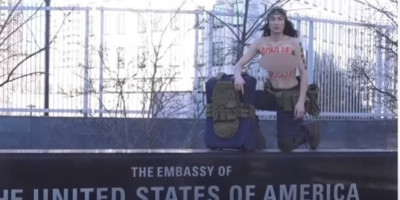 Sa natpisom "Ne budi pi*ka“ ispisanim na grudima i pozirajući s oružjem ispred američke ambasade na temperaturi ispod nule u glavnom gradu Ukrajine, aktivistkinja grupe za ženska prava Femen u toplesu održala je solo protest protiv Američkih diplomata usred tenzija na granici Rusije i Ukrajine.