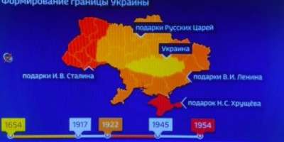 Naime, žutom bojom je označena "prava" Ukrajina, dok su ostali delovi označeni kao "pokloni" koje su Josif Staljin, Vladimir Iljič Lenjin i Nikita Hruščov dali Ukrajini.