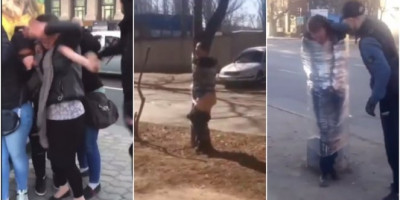 Na Tviteru se deli strašan snimak iz grada Krivi Rig u centralnoj Ukrajini na kojem nasilnik tuče čoveka privezanog lepljivom folijom za banderu.