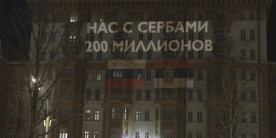 "NIKADA NEĆEMO ZABORAVITI, NIKADA NEĆEMO OPROSTITI, NIKADA VIŠE NEĆEMO DOZVOLITI" zasvetlelo se na zgradi, posle čega se pojavila svetlosna projektovana poruka "NAS I SRBA - 200 MILIONA", sa ruskom i srpskom zastavom.