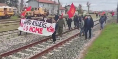 Vidi se samo grupa ljudi koji nose transparent na kom piše "NATO ubice, idite kući", ispisan na engleskom jeziku.