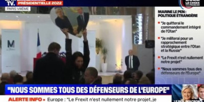 Konferencija za štampu francuske predsedničke kandidatkinje Marin Le Pen prekinuta je u jednom trenutku nakon što je žena iz publike podigla poster sa fotografijom Le Penove i Putina u obliku srca, prenosi "Le Mond"