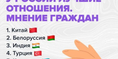Naime, građani Rusije su na pitanje koje države smatraju "najprijateljskijim" odgovorili sledećim redosledom: Kina, Belorusija, Indija, Turska, Kazahstan.