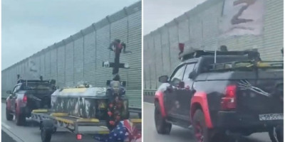 Na snimku se vidi vozilo na kojem je istaknuta zastava sa slovom "Z" koje je postalo simbol ruske Specijalne operacije u Ukrajini, kako vuče kovčeg na kojem je okačen krst i slika američkog predsednika Džoa Bajdena.