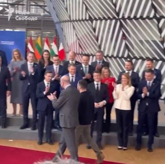 Na snimku se vidi kako Zelenski, u pratnji predsednika Evropskog saveta Šarla Mišela, prilazi šefovima zemalja članica EU. Svi, osim Orbana, aplaudiraju ukrajinskom lideru.